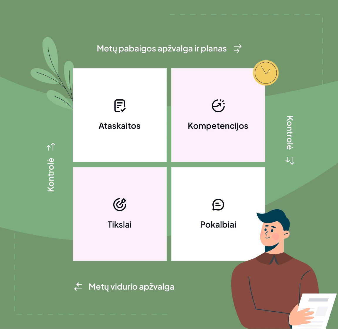 Kad ir kasdien organizuokite darbuotojų veiklos pokalbius, valdykite jų veiklą ir motyvaciją.